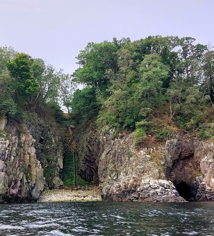 Zweiter Versuch: Diesmal gelang es, auf NW-Kurs weiter Richtung Gudhjem voranzukommen. Während ein feiner Regen in Schwaden über Land und Meer zog, ruderten wir an einer bizarren Felsküste entlang, gekrönt von Wald, aus dem gelegentlich bunte Häuser lugten. Am Campingplatz Melsted angekommen wurden die Zelte aufgebaut.