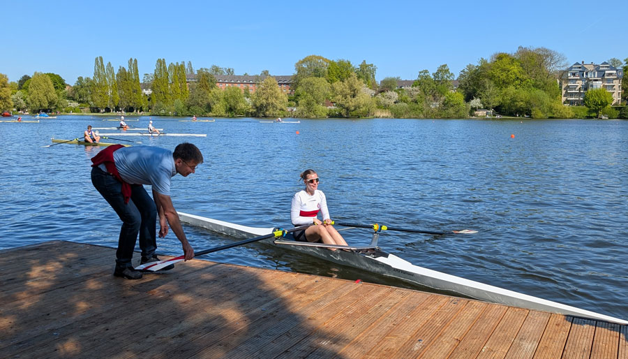 Im Einer lief es für Emma erfolgreicher, dort erruderte sie sich auf 500 Metern den zweiten Platz. Auch sonst blieb es an diesem Tag bei imaginären „Silbermedaillen“ – die in Lübeck bekanntlich nicht verteilt werden: Finn Leggeri startete ebenfalls im Einer und wurde auf 1.000 Metern Zweiter.